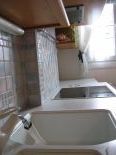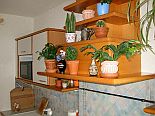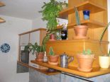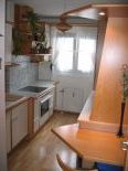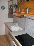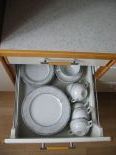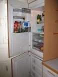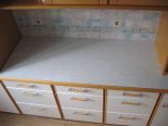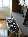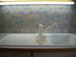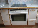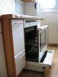 Regina Einbauküche Typ Medea mit vorgesetztem Siemens Herd (Ceranfeld mit Restwärmeanzeige, Backwagen mit Ober- und Unterhitze, Heißluft, 3D Heißluft, Umluftgrillen, Flachgrillen), Siemens Top-Line Kühlautomat mit Mehrzonen Frischebereich und Tiefkühlbereich, Vollholzverkleideter Dunstabzug, Siemens Spülmaschine, Mikrowellenplatz. Weiße Abwasch mit Grohe Einhand-Mischarmatur mit Auszugsbrause. Kleiner Frühstücksplatz; Durchreiche zum Essplatz im Wohnzimmer.