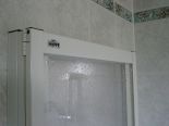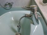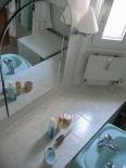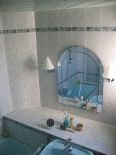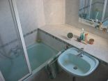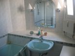Ägäisgrüne, "warme" Polypex-Einbauwanne mit verchromter Grohe Einhandmischbatterie, Grohe Schlauchbrause mit Wandhalterung. Waschbecken (Duravit) aus ägäisgrünem Porzellan mit verchromter Grohe Auszugs-Einhandmischarmatur. Weitere Besonderheiten: Holzdecke, faltbare Kunstglas-Duschwand von Hüppe, Spiegelleuchten, Spiegel, Badezimmerkästen Sanipa, Außenfenster, Waschmaschinenanschluss.